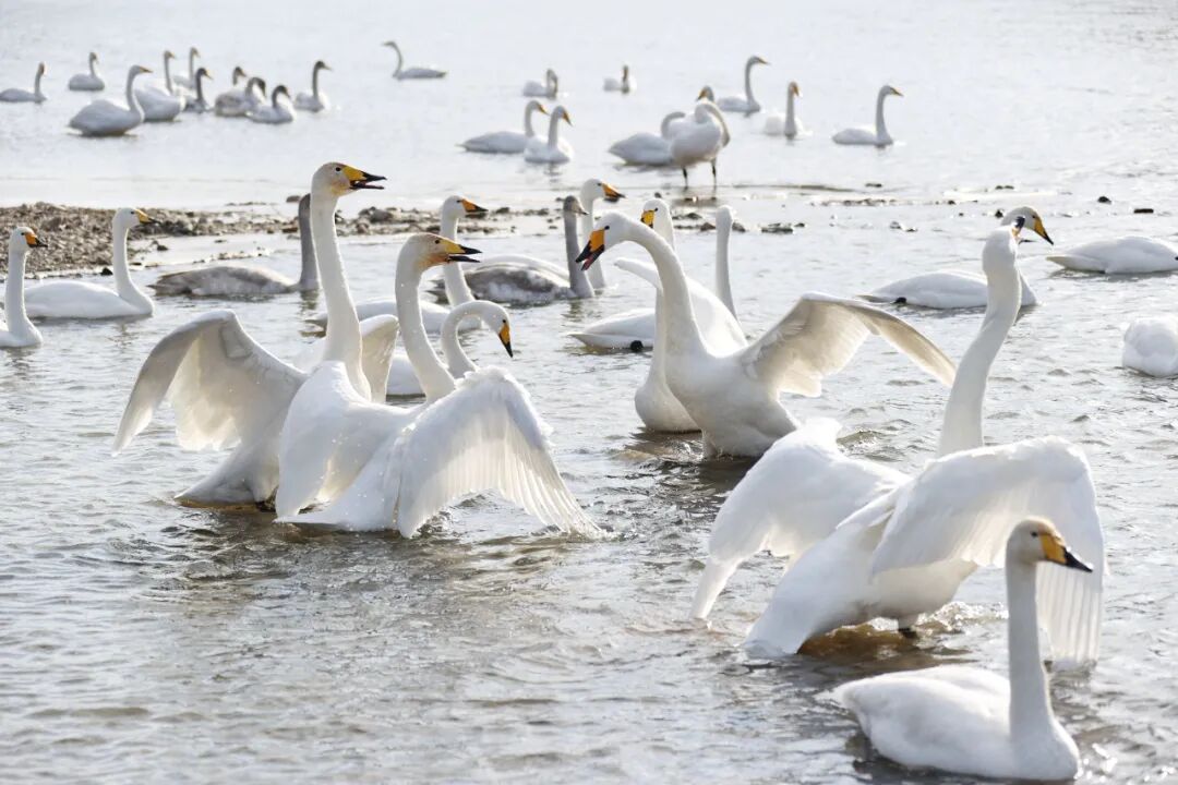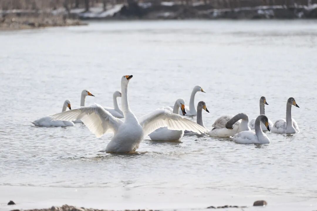 在南八家子乡红村天鹅湾,每天清晨都是天鹅最活跃的时段,这些洁白的精灵或是戏水觅食,或是踏水腾空,鹅鸣之声响彻凌河之畔。